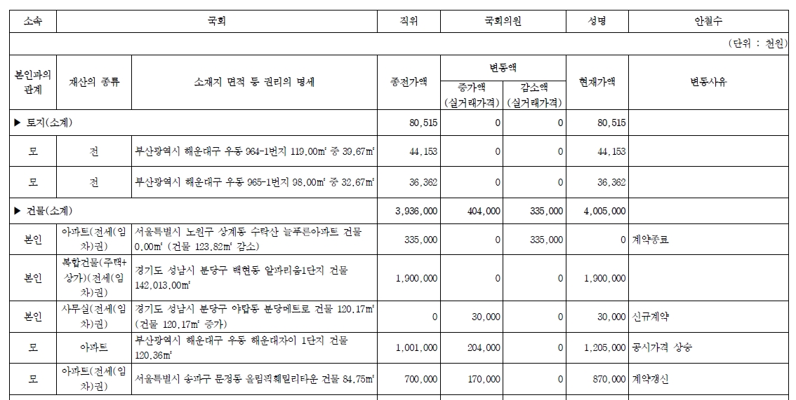 안철수 의원 재산 내역에는 부산 해운대구에 위치한 토지와 건물, 서울 노원구와 경기도 성남시에 위치한 아파트와 사무실 등의 부동산이 포함되어 있습니다.
